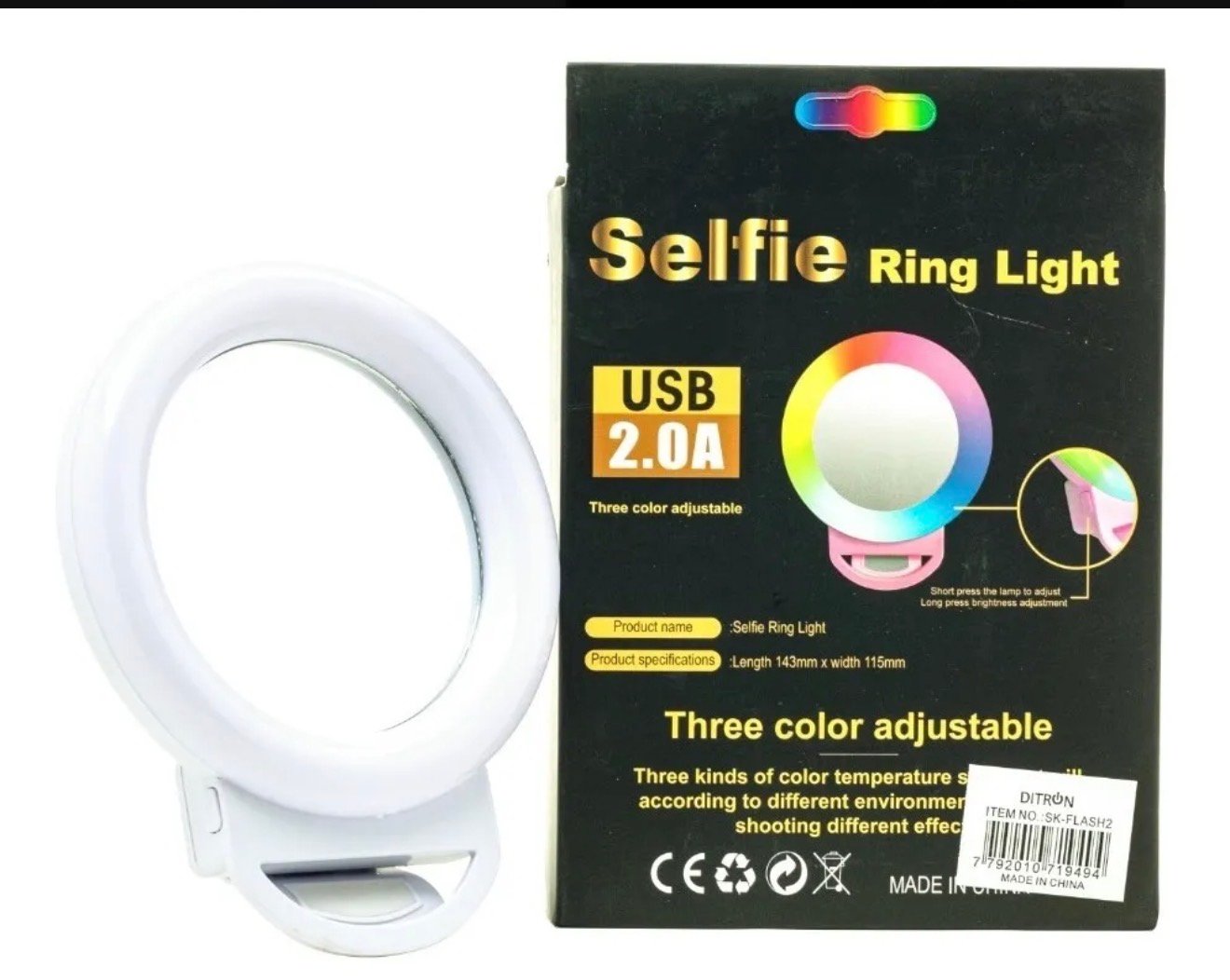 Aro de luz selfie ring light Marca: OTROS SKU: 6142 Disponibilidad: En stock $25.000 COP. Antes: $40.000 COP. -38% Cantidad Agregar al Carrito Compartir: Descripción CARACTERISTICAS:- Colores aleatorios (ROSA, CELESTE, BLANCO, NEGRO)Aro Luz Led RGB Para Selfies Celular Tablet AnilloLuz LED para selfies te proporciona la iluminación correcta y necesaria para tomar una buena fotografía o video. Gracias a los poderosos Chips LED tenés la oportunidad de obtener imágenes mucho más nítidas y más detalladas. El acabado mate asegura que tus fotos salgan como profesionales como en un estudio fotográfico. Fácil de manejar, con clip o gancho para asegurar en el celular, tableta o pc.CaracteristicasColor: Blanco, Azul, negro o RosaDimensiones: Ø120 mm aprox.Material: ABSPeso: 80 grCOLOR ALEATORIO: (COLORES DISPONIBLES ROSA, CELESTE, NEGRO Y BLANCO) Etiquetas: AROS DE LUCES /SOPORTES & HOLDER