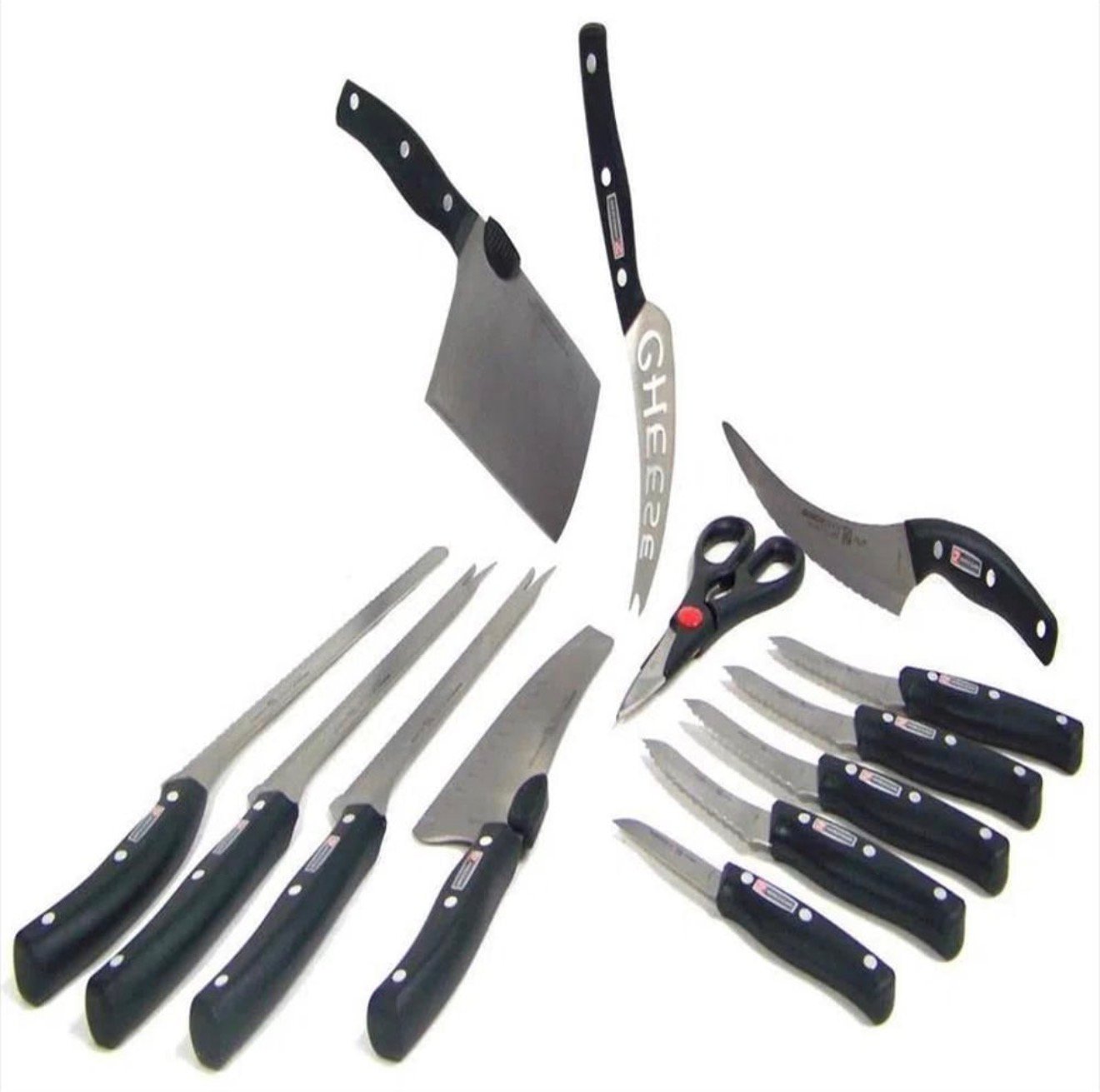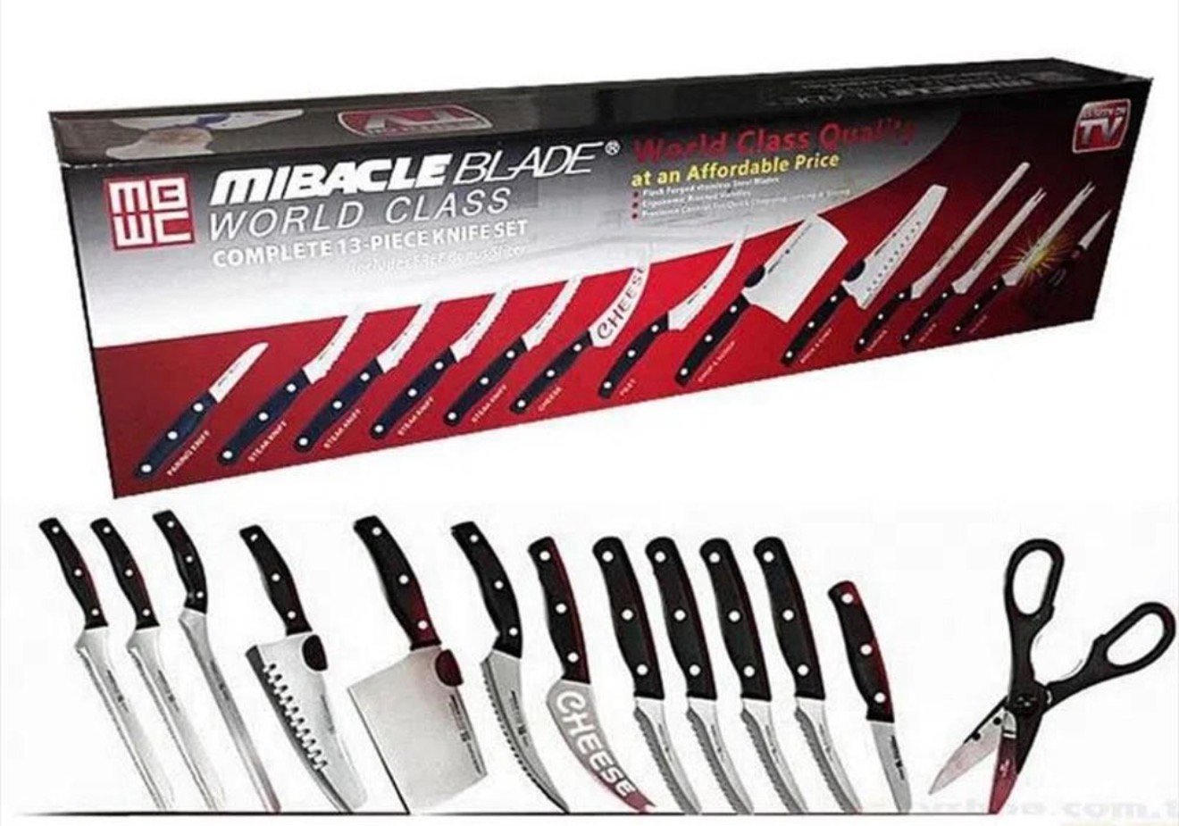 Se trata de un kit de 13 piezas que incluye cuchillos de carne, jamonero, tijeras y varios cuchillos de corte específico. Con el set de cuchillos MIRACLE BLADE X 13 piezas podrás lograr cortes finos y perfectos en distintos alimentos. Incluye 1 cuchillo de trinchar, 1 macheta 30cm, 1 trituradora, 1 cuchillo para queso, 1 cuchillo para filetear,