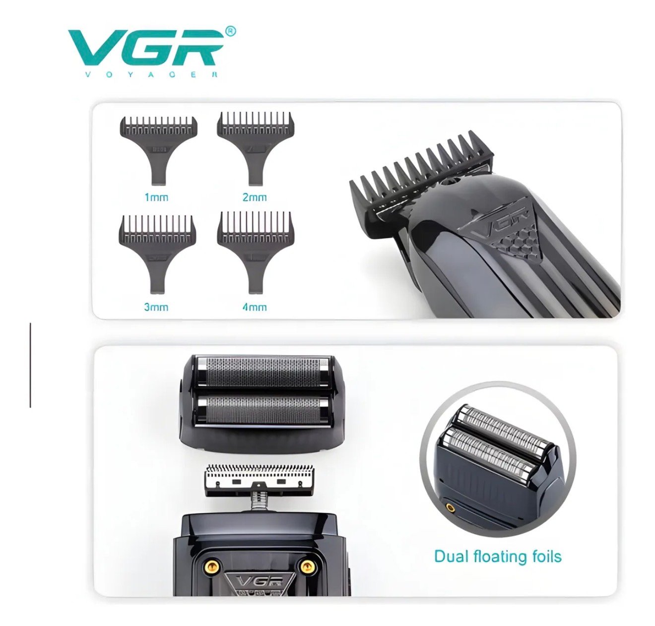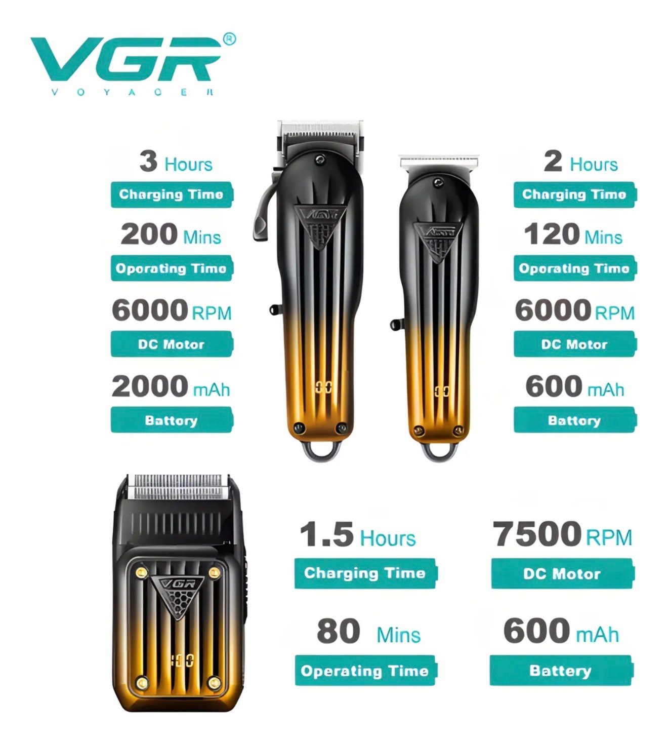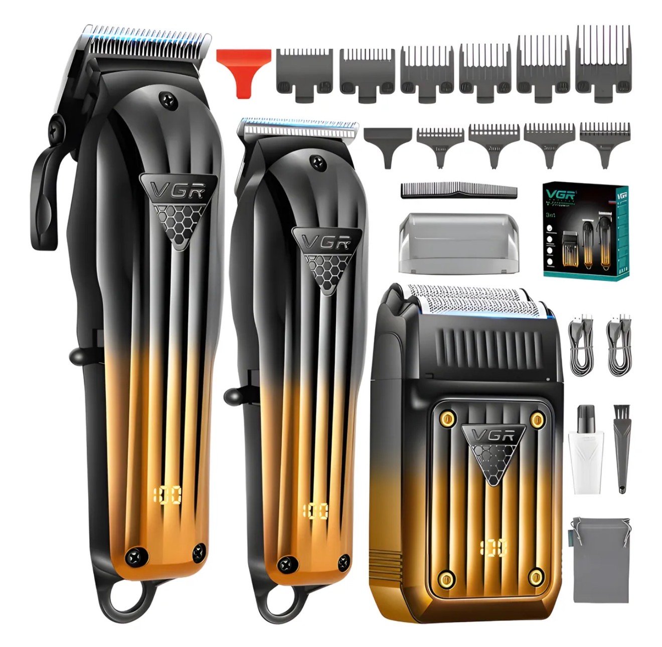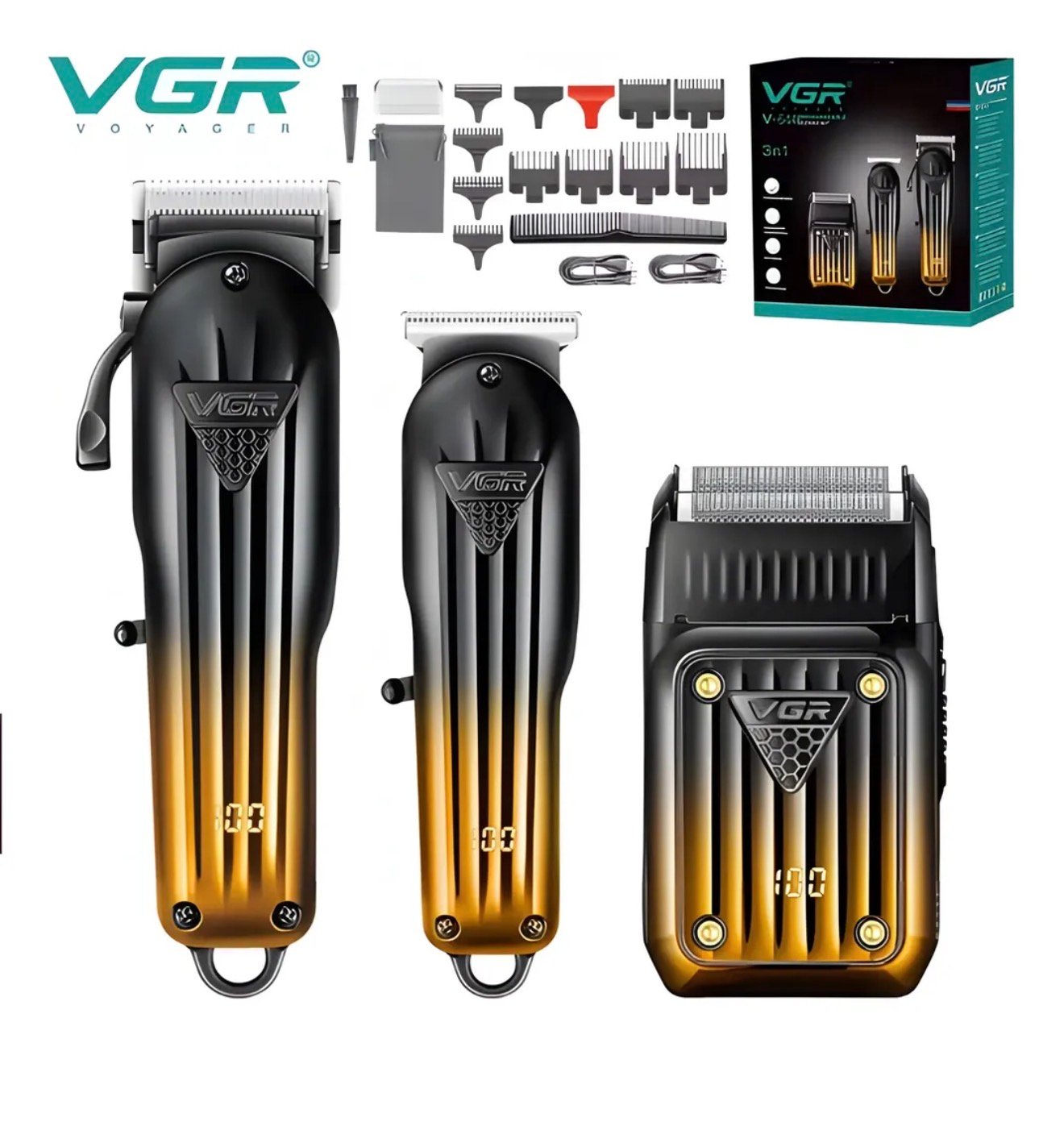 VGR 3 en 1! Diseñado para los que buscan resultados de barbería en casa, este set incluye una potente cortadora de cabello, una recortadora de detalles con cuchilla en T y una afeitadora de doble lámina que trabaja al ras. Con una estética elegante en negro y dorado metálico, no solo ofrece rendimiento, sino también estilo.